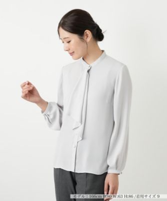 アシンメトリーに流れるフロントのドレープが、顔周りを華やかに見せるボウタイ風ブラウス。とろみのある滑らかな生地感も相俟って優雅で女性らしいシルエットを描き、繊細な透け感をお楽しみいただけます。ジャケットやコートのインナーとしても美しく映え、オフィススタイルをぐっと上品な印象に仕上げてくれそうな一枚。フロントにあしらったくるみボタンもさりげないこだわりを感じられるディテール。------------------着用シーズン:秋 伸縮性:なし透け感:ありポケット:なし生地の厚さ:薄手お取扱い方法:ウォッシャブル(手洗い可)付属品:タイ取り外し不可-------------------※商品の色味は、撮影場所や光のあたり具合、お客様のお使いの機器により色味が違って見える場合がございます。予めご了承ください。■□Leilian WHITE LABEL(ホワイトレーベル)・・・実力派デザイナーとの協業で、ベーシックな商品によりトレンド性を取り入れたブランドです。□■/レディース トップス シャツ・ブラウス ボウタイ風ブラウス【セレモニー】【Leilian WHITE LABEL】