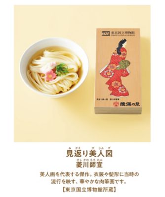 見返り美人図 菱川師宣つるりとした食感とコシが特徴の手延べうどん。振袖の模様や髪型に当時の流行を映し出す、華やかな肉筆画の限定箱でお届けします。三越伊勢丹のお歳暮カタログ掲載商品【A349423】 ※原材料・添加物・特定原材料(アレルギー)などの情報を確認いただけます。※別のサイトへ遷移します。/麺類 うどん・そば その他うどん・そば
