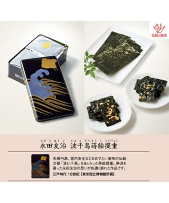 永田友治 波千鳥蒔絵提重砕いたおかきを海苔ではさんだ一口サイズの「はさみ焼き」2種と、山葵風味の味付のりをセットに。お酒のおつまみにもおすすめの一品です。三越伊勢丹のお歳暮カタログ掲載商品【B051343】 ※原材料・添加物・特定原材料(アレルギー)などの情報を確認いただけます。※別のサイトへ遷移します。/グローサリー 海苔 山城屋