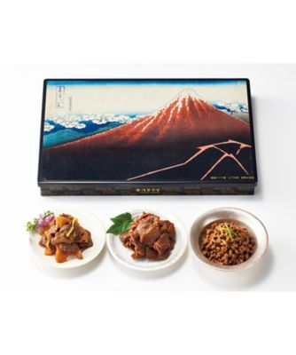 葛飾北斎 冨嶽三十六景 山下白雨国産牛肉をすき焼風の味わいで柔らかく煮あげた「牛肉すきやき」、歯ざわりのよい「牛肉れんこん」など、ご飯にもお酒にもぴったりな、牛肉佃煮3種の詰合せです。三越伊勢丹のお歳暮カタログ掲載商品【B051543】 ※原材料・添加物・特定原材料(アレルギー)などの情報を確認いただけます。※別のサイトへ遷移します。/グローサリー 佃煮・和惣菜 浅草今半