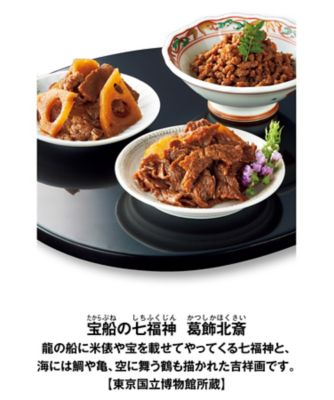 宝船の七福神 葛飾北斎国産牛肉をすき焼風の味わいで柔らかく煮あげた「牛肉すきやき」、歯触りのよい「牛肉れんこん」など3種の牛肉佃煮を詰め合わせました。葛飾北斎の「宝船の七福神」をあしらった縁起のよい限定缶でお贈りします。【A284753】 ※原材料・添加物・特定原材料(アレルギー)などの情報を確認いただけます。※別のサイトへ遷移します。/グローサリー 佃煮・和惣菜 浅草今半
