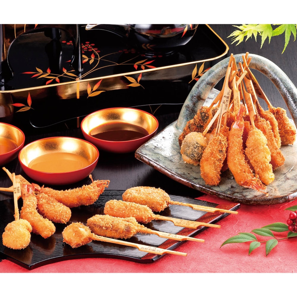 【ベルメゾン】迎春串揚げセット 42串 集い旬食材から迎春の縁起物まで20種。揚げ時間やおすすめのたれが串に印字され、調理も簡単に。