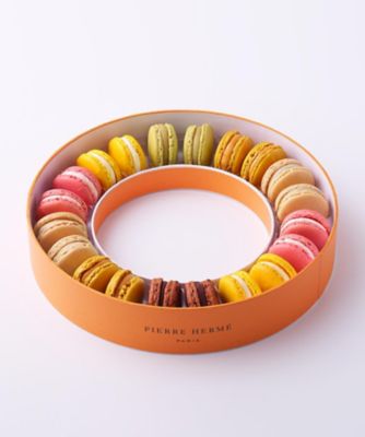 ピエール・エルメ・パリの代表アイテム、マカロン。斬新なリング型のマカロンボックスに人気の高い定番フレーバー、季節フレーバーを詰め合わせた20個入りギフトです。どなたにも喜ばれる定番の詰め合わせ内容は、贈り物や手土産などのギフトとしても最適です。(フレーバーは、季節によって異なります)