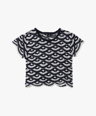 波のような編み模様と透かしデザインが特徴のショート丈トップス。ネイビーとホワイトの配色が爽やかで、マリンテイストを感じさせる一枚です。原産国:イタリア組成:綿74% ナイロン26%実寸情報1 (S)肩幅:40cm/バスト:84cm/袖丈:11cm/身丈:43cm2 (M)肩幅:44cm/バスト:92cm/袖丈:11cm/身丈:44cm3 (L)肩幅:47cm/バスト:100cm/袖丈:11cm/身丈:45cmモデル身長/173cm、着用サイズ/1 (##)/レディース トップス その他トップス コットン メッシュ フレンチスリーブ トップス "Dentelle"(45T5LH546143)