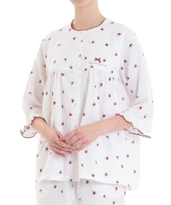 【素材】綿100%のガーゼを2枚重ね合わせて作られた素材の「コットンダブルガーゼ」。赤ちゃんの産着としても使われているほど、お肌に優しく、洗うたびに柔らかく馴染んでいきます。通気性、吸水・吸湿性に優れた生地で、汗をすばやく吸収し、発散してくれる為寝汗による不快感や冷えを防止します。また、肌を冷やす原因となる湿度を放出し、暖かい空気を生地の中に溜め込むことができます。オールシーズン人気の素材で、ナルエーでは「上質な眠りの為の素材」として推奨しています。【デザインポイント】バスト切り替えの前開きパジャマ。透け感が気になるバストラインは胸ヨークを2枚仕立てにして素肌にも安心な着用感に。襟まわりにはお洗濯しても型崩れのしにくい、ケミカルレースを使用しました。腕をきれいに見せてくれる絶妙な袖丈は肘までカバーしてくれます。袖口の小ぶりなフリルでかわいらしい印象に。パンツ左右に便利なポケット付き。※照明の関係により、実際よりも色味が違って見える場合があります。 またパソコン・スマートフォンなどの環境により、製品と画像のカラーが若干異なる場合もございます。 型番:26-11422/レディース 下着・パジャマ・ルームウェア パジャマ・ルームウェア コットンダブルガーゼいちご7分袖パジャマ 26ー11422