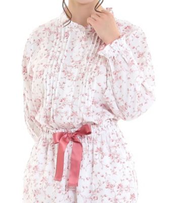 【素材】2枚の生地を重ね合わせたコットンダブルガーゼ素材。綿は繊維の先端が丸く、肌の刺激が少ない、やわらかでやさしい素材です。通気性にも優れている為、寝ている間の汗をしっかりキャッチして肌を快適な状態に保ってくれます。また、赤ちゃんの産着としても使われているほどお肌に優しく、洗うたびに柔らかく馴染んでいきます。ナルエーでは「コットンWガーゼ」を上質な睡眠へ導く素材として推奨しています。【デザインポイント】毎回大人気のフランス伝統の「トワルドジュイ」の柄をいちご柄で描きました。いちごは小さく可愛らしい実のデザインに。襟まわりの小ぶりなフリルがエレガントな印象のセットアップ。パジャマとしてのリラックス感はありつつ、上品なきちんと感を叶えるムーンタンならではの一着です。胸元のタックが胸のラインをカバーしてくれるため、素肌でも安心して着用できます。パンツの裾にはゴムを入れ、低身長さんにも安心な着用感です。左右には便利なポケット、インしてもかわいいウエストリボンを付けました。※照明の関係により、実際よりも色味が違って見える場合があります。 またパソコン・スマートフォンなどの環境により、製品と画像のカラーが若干異なる場合もございます。型番:26-11416/レディース 下着・パジャマ・ルームウェア パジャマ・ルームウェア 40/ダブルガーゼプティフレーズピンタックパジャマ 26ー11416